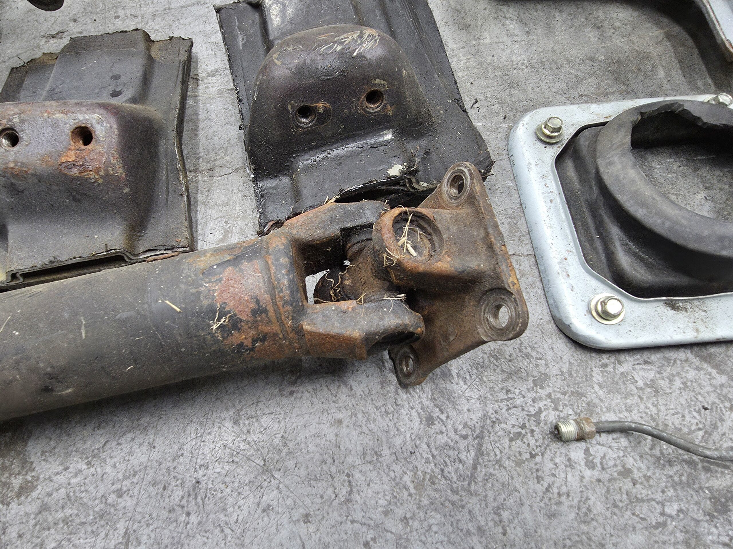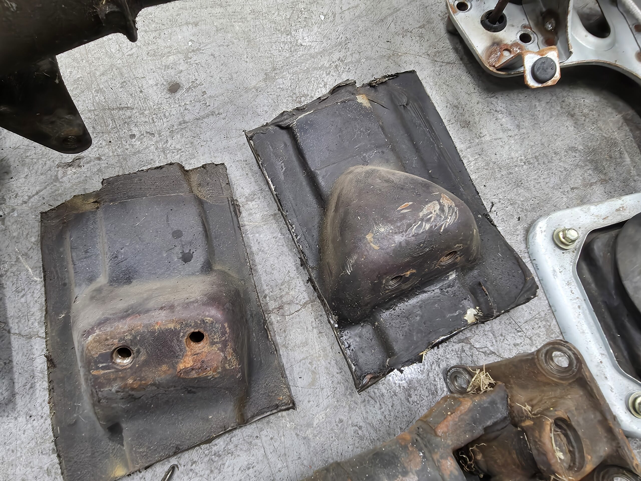 -manual transmission chassis/trans tunnel mounts cut out of the donor car, you can strip and weld these to your auto car’s trans tunnel (auto mounts are in a different location)
