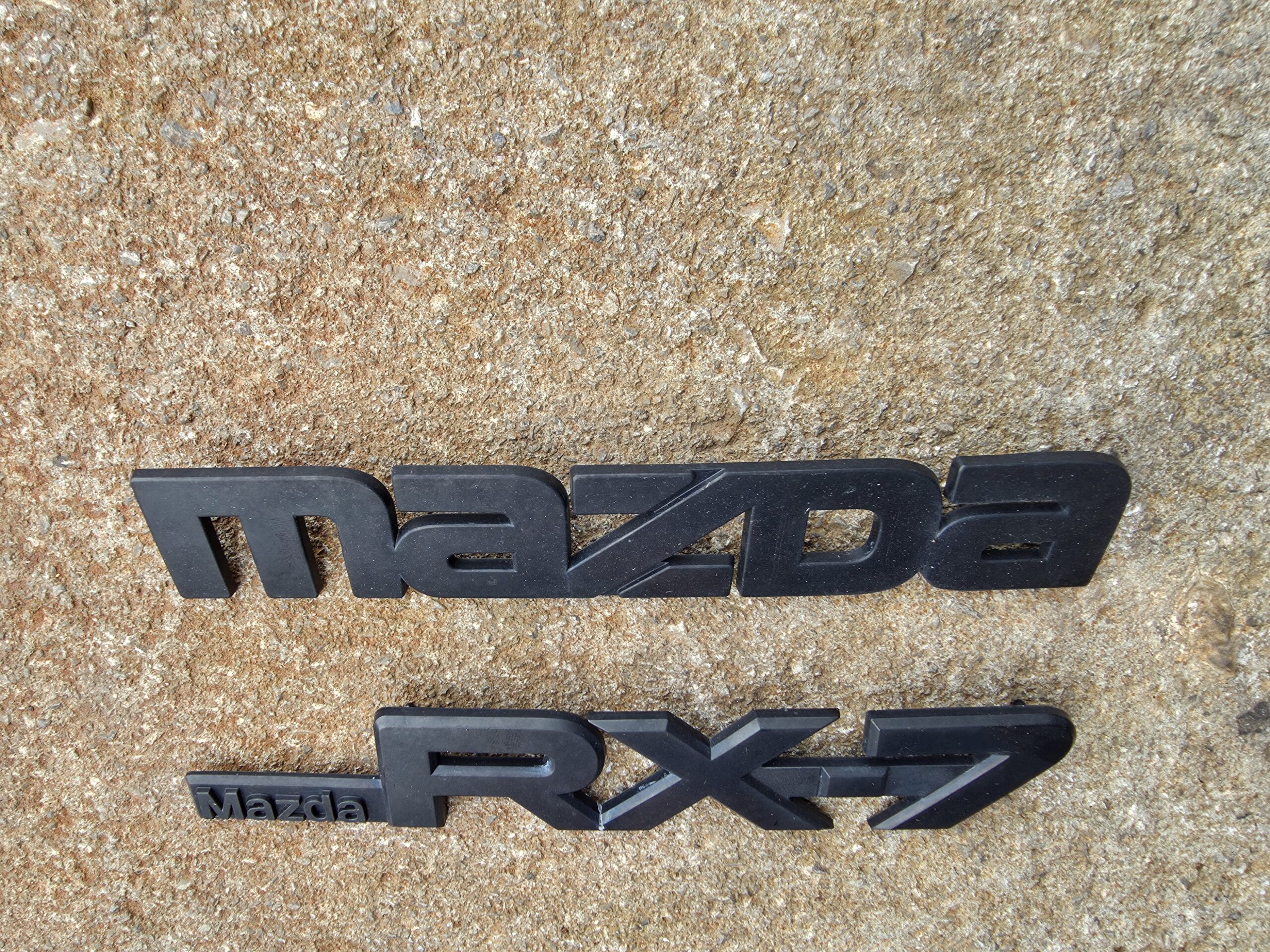 86-91 rx7 FC plastic rear logo badge emblem set pair. some mounting pins missing, you will mount these with double sided tape in areas without pins. I believe the “mazda” badge is discontinued/NLA new and the “RX-7” badge retails for $45 new.