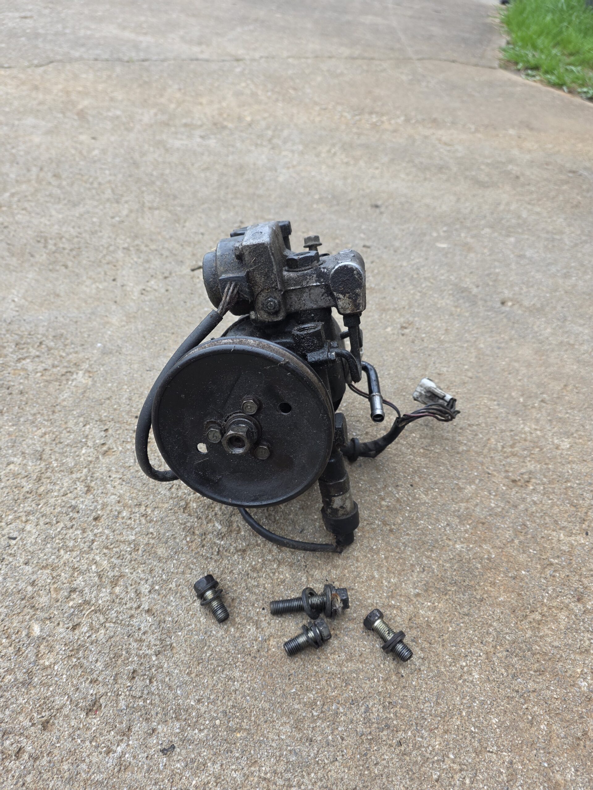 rx7 FC 86-91 power steering pump w/ pulley. This one has 2 ports on top, if you are installing this on an 89-91 car be sure yours has 2 ports on top (some of them had only one port on top). Also if installing on 89-91 you will have to swap the bottom sensor with your 1-wire sensor. Removed from a non running, already disassembled 88 non turbo.