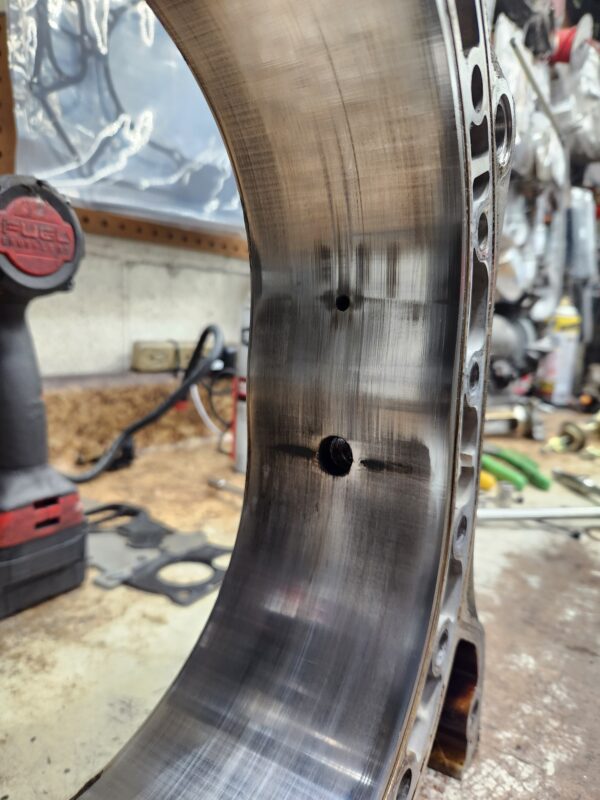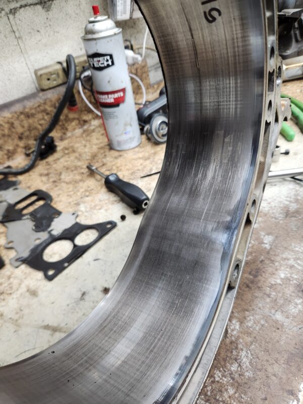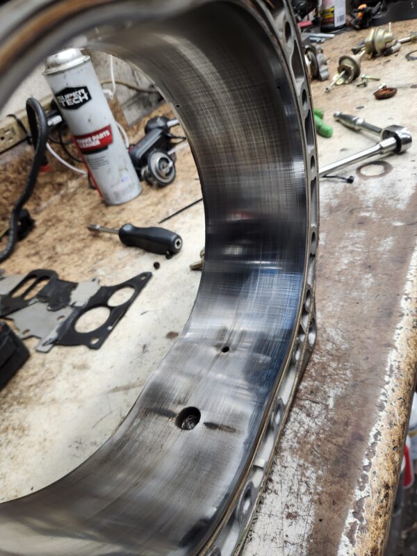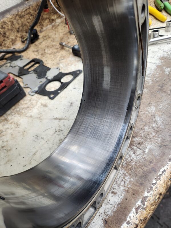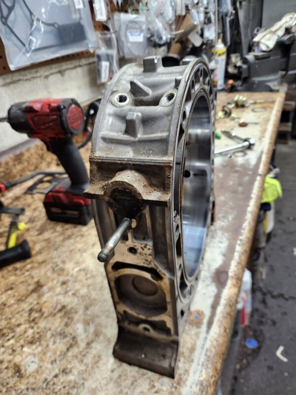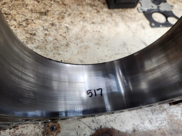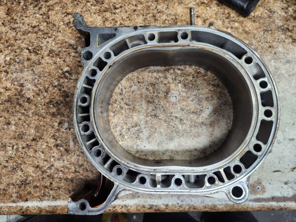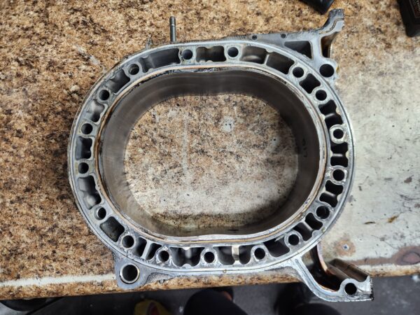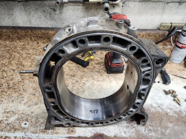rx8 04-08 used engine rotor housing 517 (this is an internal ID number I chose to mark, which ensures that you get the exact housing pictured). Has normal edge wear, chrome flaking, and grooving common to used housings and shows some cracking by the L plug hole. examine the pics closely to be sure you accept it’s condition.